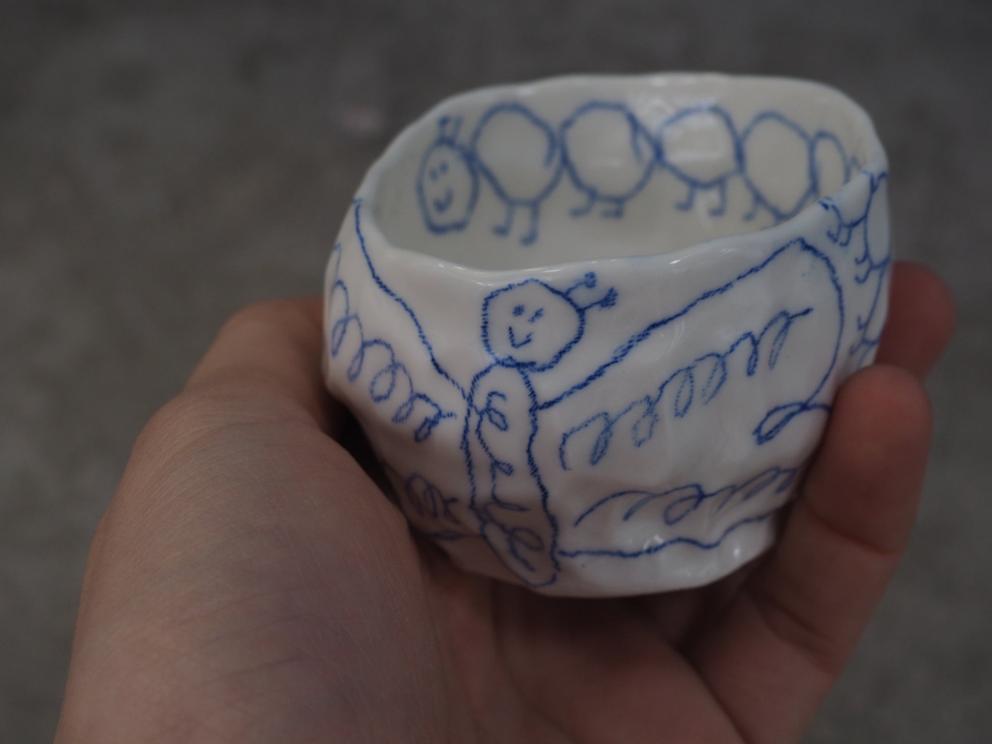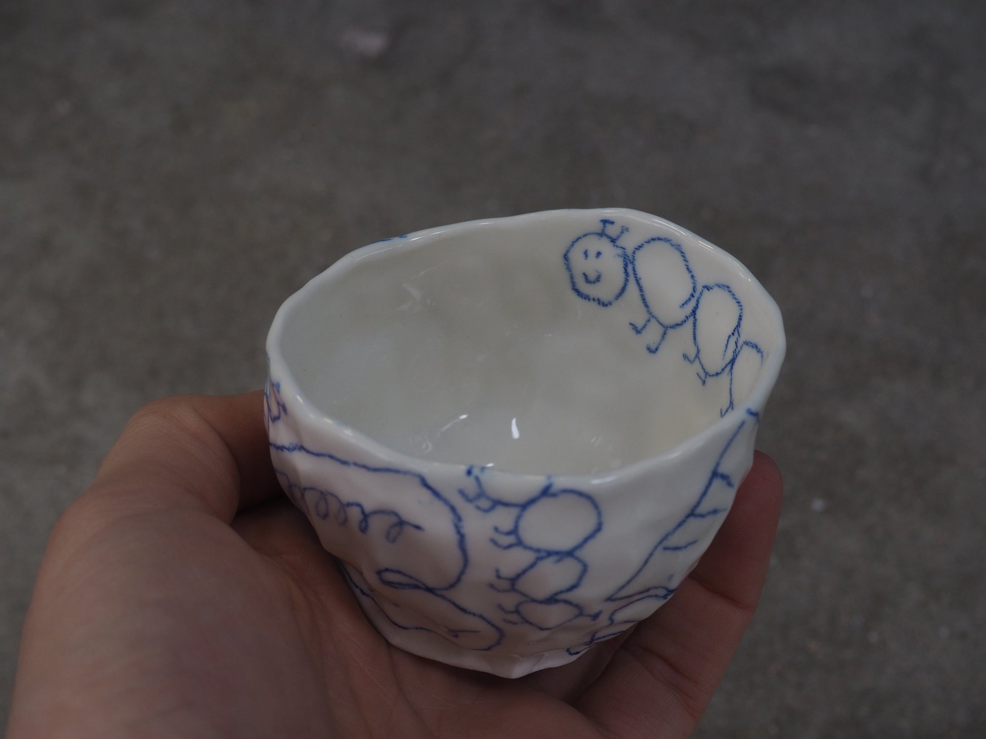 Be careful, every porcelain is slightly different. I made all the cups by hand with the "pinch" technique so every porcelain is shaped different and every drawings is a little bit different from the picture :-)