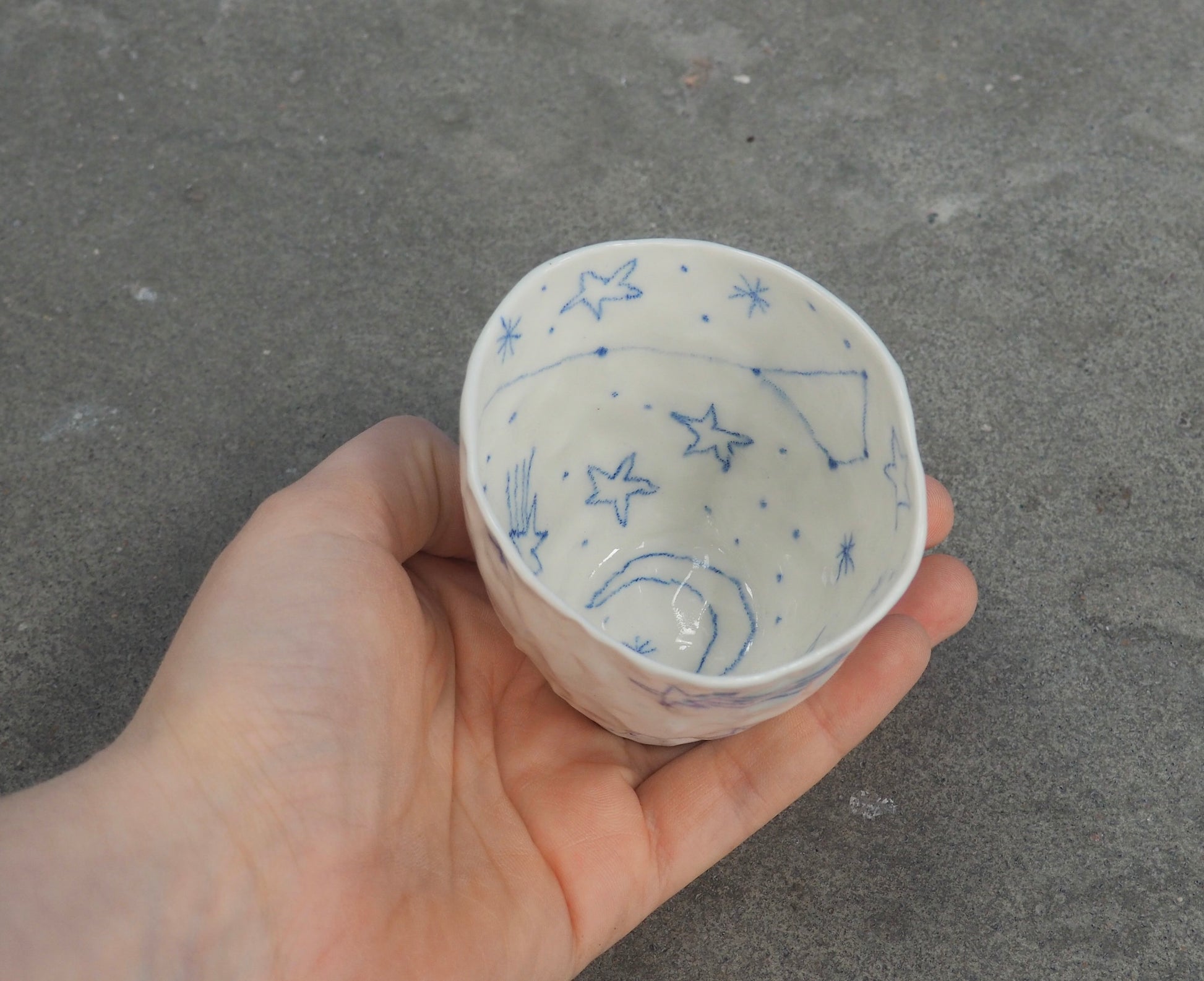Be careful, every porcelain is slightly different. I made all the cups by hand with the "pinch" technique so every porcelain is shaped different and every drawings is a little bit different from the picture :-)